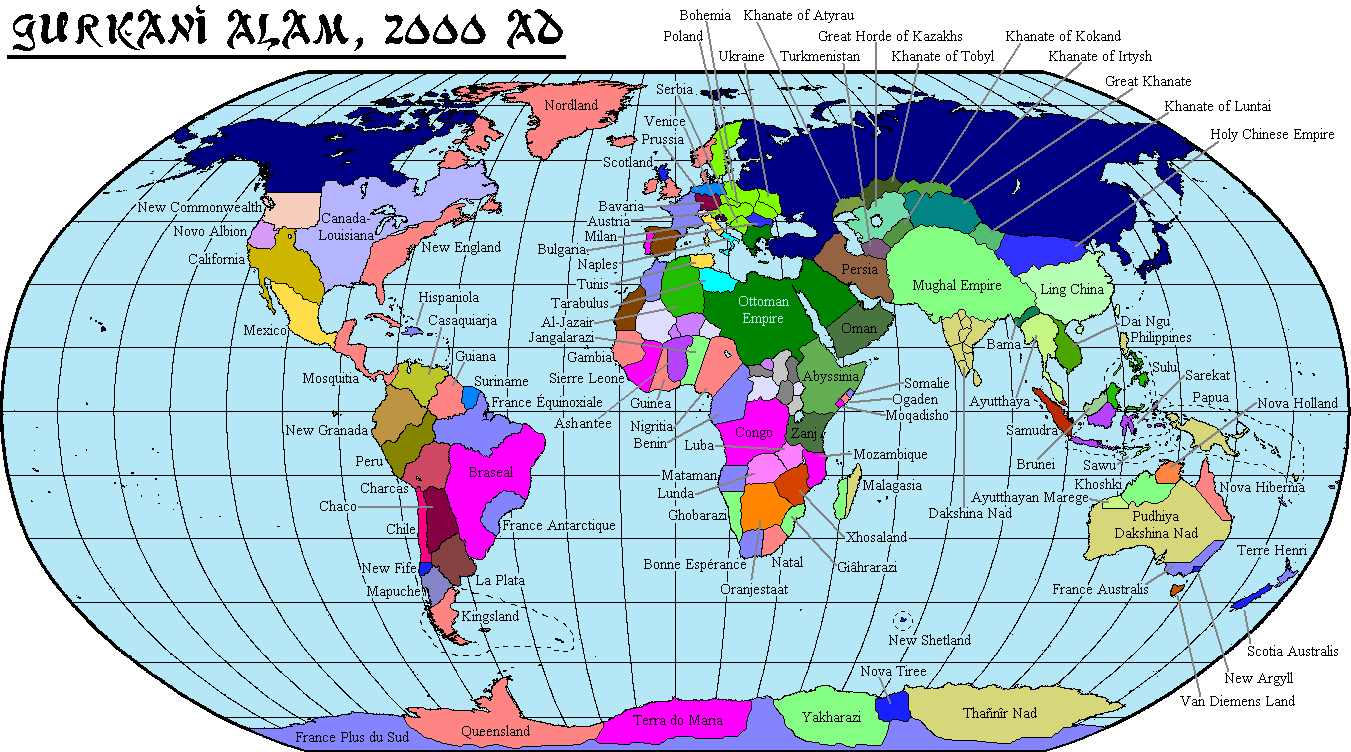 With India remaining rich and strong, European colonialism around the Indian Ocean was curtailed, leaving the Indian states and their allies in effective control of southern and south-eastern Asia, Oceania and East Africa, with Europe taking control of West Africa and the Americas. In northern Asia, Russia, reborn as the theocratic old believer Holy Russian Empire, is the only European-derived power.